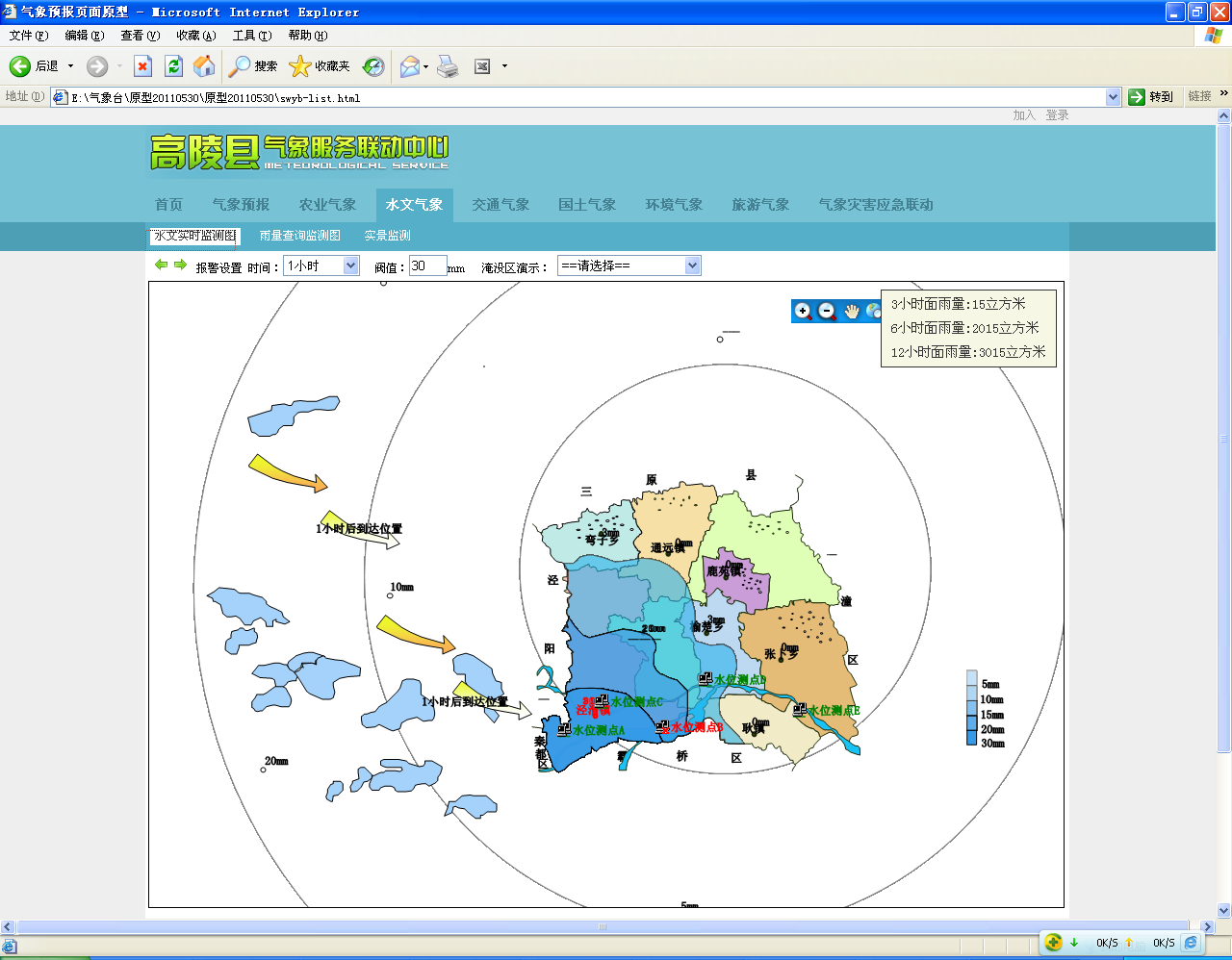 (1)防汛灾害预警三级响应模型:将高陵县半径50公里、50-100公里、100-150公里分为三个级别预警圈层,根据天气系统的移动位置和强度,分级启动预警级别。